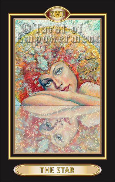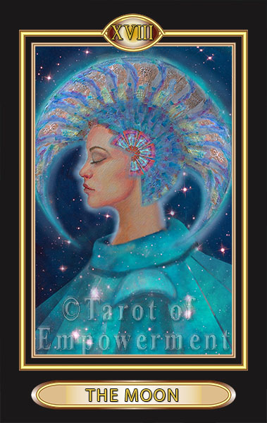 The Moon(shown here from the Tarot of Empowerment deck) card symbolizes the subconscious mind, intuition, and the mysteries hidden beneath the surface. When the Moon comes up for you in a reading, be aware of the difference between illusions and reality and pay attention to the internal tides of your dreams and feelings. Take time to contemplate, listen carefully, and look for the light from within to reveal the truth of the matter. Learn to trust your intuition. Read the full meaning here.