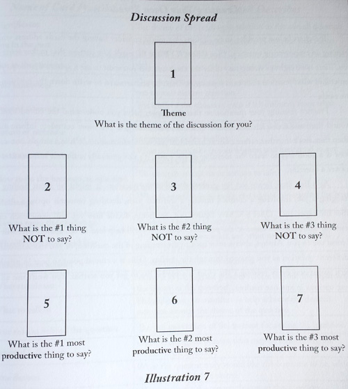 The first card (theme) defines you in relation to the conversation. Cards 2 through 4 are what NOT to say to be heard. Cards 5 through 7 are what to say instead of the card directly above. My clients often tell me the what NOT to say is exactly what they have been saying. When they replace it with, “What to say” they feel heard and get results.